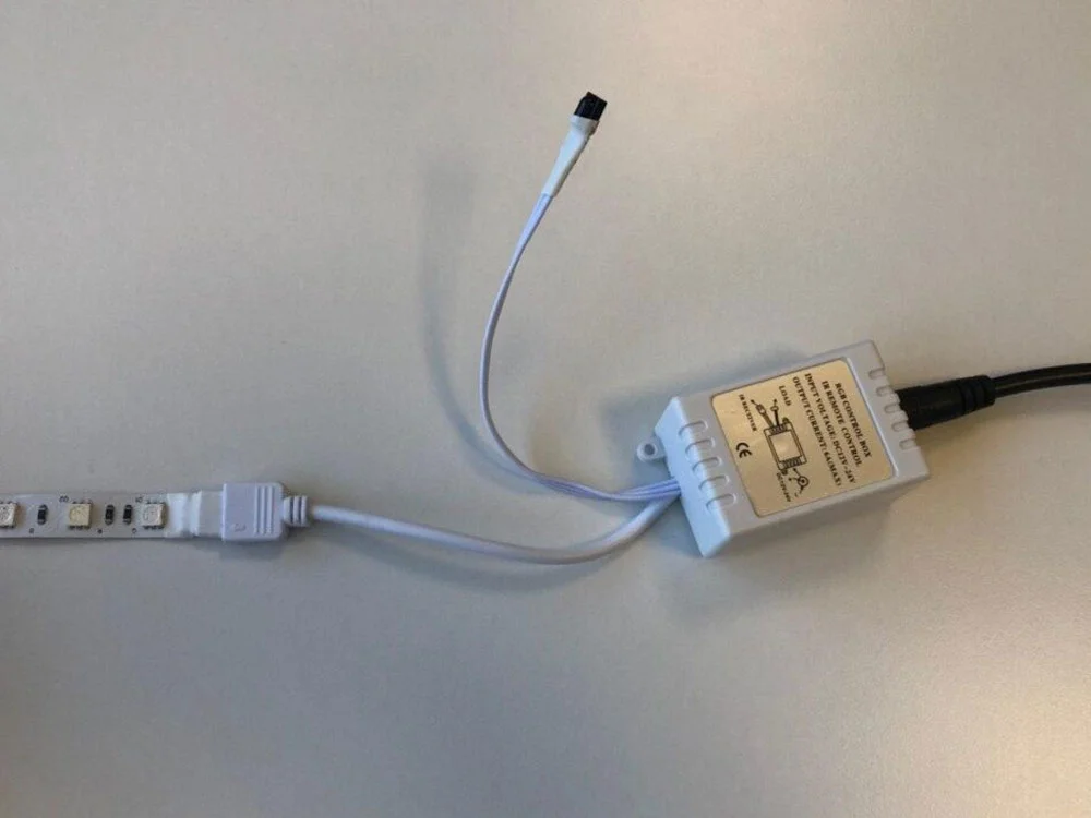 1. LED-Streifen mit dem Controller verbinden: Stecke den Connector in den Empfänger. Achte darauf, dass die Pfeile an den Anschlüssen zueinander zeigen.